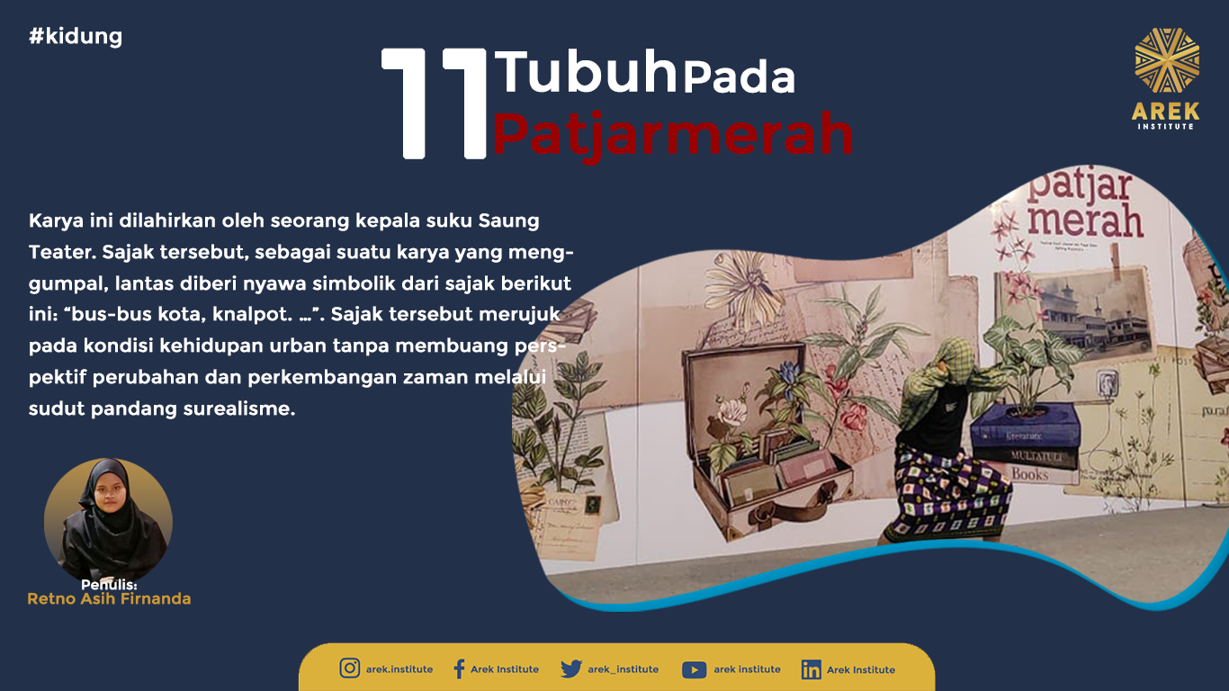Arek Institute memposisikan dirinya sebagai alpha di panggung utama Patjarmerah Surabaya. Mereka mengeksplor puisi “11 Tubuh Dalam Kamar Surabaya” yang terdapat dalam kompilasi puisi “Tubuh Mati Menyantap Dirinya Sendiri”melalui gerak statis dan olah tubuh yang dinamis. Hanya dengan sarung, suasana dihukum untuk senyap. Secara ketarturan gerak, Adnan memihak usungan baru dari puisi 11 Tubuh Dalam Kamar Surabaya menjadi lakon yang semakin menjadi. Nyawa yang dipertanyakan terlihat sempurna.